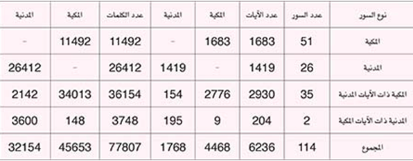 عدد سور القرآن الكريم وآياته وكلماته حسب تقسيم السور المكية والمدنية:
